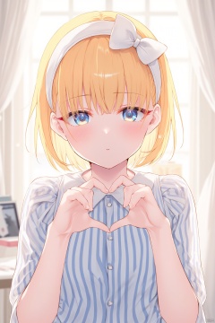 The image is an illustration of a young girl with blonde hair and blue eyes. She is wearing a white headband with a bow on top and a blue and white striped shirt underneath. She has a serious expression on her face and is making a heart shape with her hands. The background is a room with a window and a white curtain. The overall style of the illustration is anime-style.