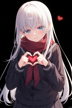 The image is an illustration of a young girl with long white hair and blue eyes. She is wearing a black school uniform with a red scarf around her neck. The girl is holding a small red heart in her hands and is making a heart shape with her fingers. The background is black, making the girl and the heart stand out. The overall mood of the image is peaceful and serene.