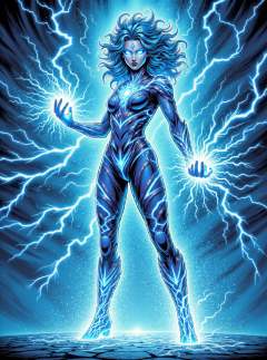 donmc0m1cm4g1cfx magic, female conqueror  lightning magic jagged streaks of electric blue white energy, crackling intensely around a pulsating core, sizzles and pops with static, ground is faintly glowing