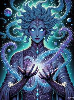 donmc0m1cm4g1cfx magic, female thaumaturge, creation and control of holographic illusions, dieselpunk  Conjuring ensorcell shaped like Shimmer of vibrant abyssal water and creating illusions