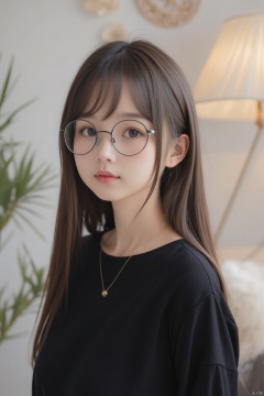 This is a high-resolution portrait of a modern style, featuring a young woman., "Capture the essence of modern elegance with a full-body portrait of a young woman. She possesses an oval face framed by long, dark hair, and her almond-shaped eyes reflect a neutral yet thoughtful expression. Her attire is simple yet stylish, featuring a black top and glasses that add a touch of contemporary sophistication. The light makeup enhances her natural beauty without overpowering it. The indoor setting is adorned with wall decorations that hint at personal taste and artistic flair. The composition should highlight her clear skin texture under soft, natural lighting, creating a warm and inviting atmosphere. This image not only showcases her aesthetic appeal but also symbolizes the blend of simplicity and elegance in contemporary life."