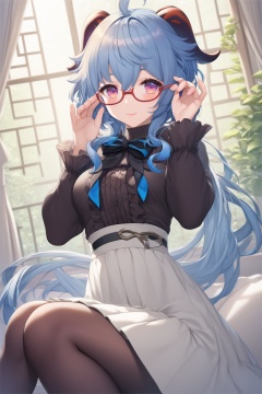 score_9,score_8_up,score_7_up,score_6_up,source_anime,source_cartoon,<lora:ganyuTuPONYXL-000008:1>,ganyu \(china merchants bank\), ganyu \(genshin impact\), 1girl, solo, horns, blue hair, high-waist skirt, glasses, blue bow, long hair, shirt, black pantyhose, black shirt, red-framed eyewear, smile, shirt tucked in, looking at viewer, ahoge, frilled shirt, long sleeves, turtleneck, frilled sleeves, sidelocks, frills, purple eyes, adjusting eyewear, sitting, breasts, medium breasts, blush, window, knees up, indoors, black bowtie