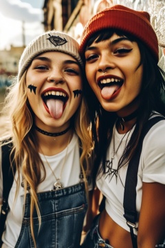 两个非主流女孩,舌头,涂鸦墙,现实风格,张开嘴巴,牙齿,白天,户外,口袋妖怪贴纸,多云天空,尖牙,舌头伸出来。