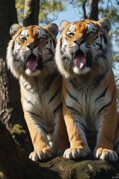 2只老虎,没有人类、舌头、树、现实、张开嘴巴、牙齿、白天、户外、动物、口袋妖怪、天空、尖牙、舌头伸出来