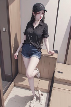 8K image., shinkai color, ((poakl)),GF,1girl, solo, long hair, breasts, looking at viewer, shirt, black hair, hat, closed mouth, standing, collarbone, short sleeves, shoes, shorts, indoors, black shirt, short shorts, bare legs, black headwear, phone, white footwear, standing on one leg, cellphone, denim, sneakers, baseball cap, denim shorts, red lips