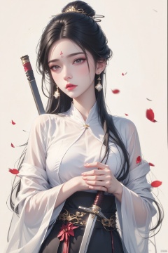 8K image.1girl, solo, long hair, black hair, hair ornament, long sleeves, dress, holding, jewelry, closed mouth, upper body, weapon, earrings, sword, hair bun, holding weapon, white dress, petals, facial mark, holding sword, chinese clothes, forehead mark, falling petals, reverse grip
