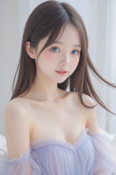 This is a high-resolution portrait of a beautiful young woman. She is wearing an elegant, off-shoulder evening gown in soft pastel colors. Her long, flowing hair is styled in loose waves, cascading over her shoulders. Her eyes are a striking shade of blue, and her lips are painted with a soft pink lipstick. Her facial features are delicate and symmetrical, with smooth, fair skin. She has a serene expression, with a slight, gentle smile. The background is softly blurred, highlighting her graceful presence and creating a dreamy, ethereal atmosphere.
