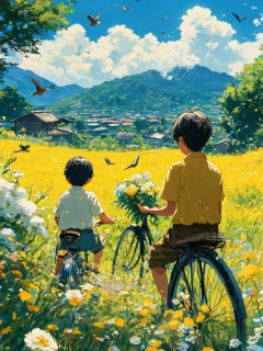 zyx01, outdoors, sky, flower, cloud, 2boys, scenery, multiple boys, day, shirt, bird, field, male focus, short hair, tree, blue sky, grass, from behind, blue shirt, short sleeves, pants, black hair, house, facing away, cloudy sky, mountain, white flower, striped, yellow flower, bicycle, standing, brown hair, nature,<lora:zyx01:0.8>,, masterpiece, best quality,