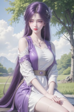 8K image.云曦Flux-起风了,purple hair,1girl, solo, long hair, looking at viewer, smile, hair ornament, dress, jewelry, sitting, purple eyes, purple hair, earrings, outdoors, necklace, white dress, tree, purple dress, bench