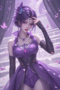 8K image.云曦Flux-起风了,purple hair,1girl, solo, hair ornament, dress, bare shoulders, jewelry, upper body, purple hair, earrings, elbow gloves, petals, facial mark, bug, butterfly, purple dress, stairs, forehead mark, falling petals