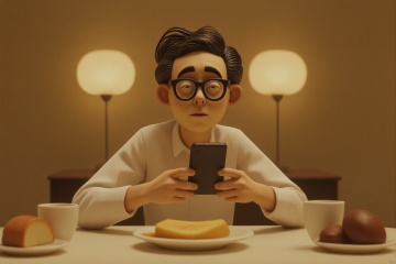 A man with glasses is sitting at the dinner table playing with his mobile phone. It's handmade. A retro movie