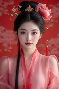 Against a vibrant, high-contrast background, a breathtaking Chinese beauty in flowing hanfu dress commands attention. Shot with 35mm f/2.0 lens, her regal presence fills the frame. Piercing black eyes gaze directly at the viewer, subtle eye makeup and defined eyebrows adding depth. Raven tresses cascade down her back, adorned with delicate hair ornament and elegant bun, peony resting atop, symbolizing prosperity. FLUX title dominates bottom of frame in bold letters, amidst busy, dynamic layout reflecting modern life's fast pace.