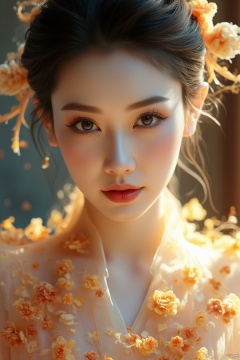 Chinese portrait photography, photography, high-definition 8K, Chinese beauties, An elegant oriental woman, creative portrait, facing the camera, close-up, half-length, 135mm, aperture 1.4, wearing a robe made of natural elements, the whole body is projected by natural elements, creating a light interaction with the skin, projecting a natural matrix of space, Natural style images, a large number of extremely small natural symbols superimposed layer by layer, the natural elements are completely random, forming a full-screen matrix, and the depth of field has a natural blurring effect.