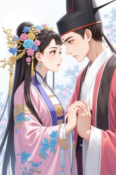 hair ornament, jewelry, long hair, flower, earrings, chinese clothes, hair flower, long sleeves, upper body, looking at another, 1girl, hat, black hair, brown eyes, 1boy, tassel, wide sleeves, hanfu, parted lips, brown hair, eye contact, hand up, facial mark, forehead mark, from side, blue flower, dress, 2girls, multiple girls