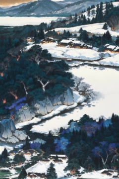 masterpiece, best quality, Chinese style countryside, snow covered fields, distant villages shimmering with a faint light, late night scenery, blue snow, orange shimmer