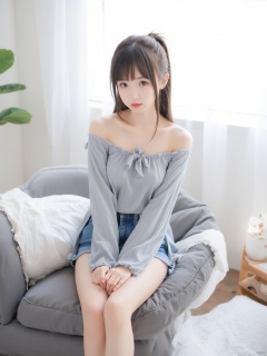 The image is a portrait of a young woman sitting on a gray couch. She is wearing a gray off-the-shoulder top and denim shorts. Her hair is styled in a half-up, half-down ponytail with bangs. She has a serious expression on her face and is looking directly at the camera. The couch is covered with a white blanket and there is a window with white blinds in the background. The overall mood of the image is relaxed and casual.