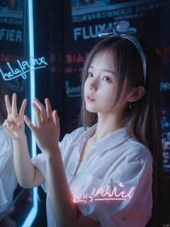 This is a modern style image of a beautiful woman touching a mirror with her hand. The image in the mirror shows a woman wearing a white shirt. Touching her finger, the text "Hello FLUX" is focused at the top of the image, and the light is focused on the person from top to bottom, creating an atmosphere in the photo. There are blue and red neon lights around the mirror