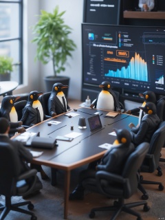 Tilt-shift photo of isometric style A serious business meeting in a high-tech conference room, but all the executives are penguins in tiny suits, one penguin at the head of the table adjusting its tie while another points at a chart with a flipper, the presentation screen showing a graph of skyrocketing fish sales, everyone around the table nodding seriously, ultra-realistic, 8k resolution, highly detailed, absurd and hilarious . vibrant, beautiful, crisp, detailed, ultra detailed, intricate . Selective focus, miniature effect, blurred background, highly detailed, vibrant, perspective control