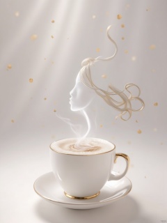 Beauty, realism, chiaroscuro, rays of light, play of shadow and light, cinematic style, Super HD, Pastel, chalk, crayon drawing, surreal and elegant image of a white coffee cup with gold accents, steam rising from it, forming a detailed and graceful silhouette of a woman's face. The woman's flowing hair smoothly transitions into the steam, with gold tones highlighting the strands. The background is a soft, light color that enhances the contrast and elegance of the cup and steam. The overall atmosphere is sophisticated, dreamy and artistic.