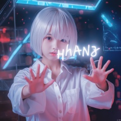 he image shows a young girl standing in front of a glass surface. She is wearing a white shirt and has short white hair, with bright, expressive large eyes. One of her hands is pressed against the glass, writing a glowing word, 'hans,' while the other hand hangs naturally by her side. The background is illuminated with vibrant blue and red neon lights, casting colorful reflections on the glass. The overall mood of the image is futuristic and dreamlike, with a strong contrast between the soft glow of the word and the vibrant neon background.