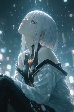 The image is an illustration of a young girl with long white hair and bangs, sitting on a bench in the rain. She is wearing a white jacket with a red and black design on the chest and black pants. The background is a cityscape with buildings and lights, and the sky is filled with raindrops. The girl is looking up towards the sky with a peaceful expression on her face. The overall mood of the image is calm and serene.