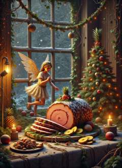 DonMN0Hum4nFX, no human, vines, sfw,   digital christmas art, sugar plum fairy, baked ham with pineapple angels , generous and giving warm and inviting reflective and grateful, floor lamps, peaceful scenes of quiet snowfall