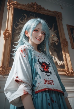 The girl looks to the side with an evil smile. She is wearing loose clothes with exquisite textures. The color of the clothes is very dreamy. The light blue color is like oil paint. The clothes begin to melt. The melted colors rushed out of the picture frame and fell to the ground,from_below,, score_9,score_8_up,score_7_up,beast_quality,masterpiece,