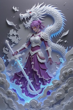1 girl, Purple hair,Purple eyes,Glowing eyes,(Beautiful face), Lich King, undead swordsman, wearing armor decorated with skulls, burning blue flames all over her body, golden glowing eyes, slashing the sword in her hand, violent, angry and fierce, standing behind A broken skeleton dragon,guijian,armor,Xguang, headless,tifa,edgdeathknight
