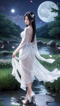 1girl,moon,weapon,dress,long hair,solo,hair ornament,black hair,white dress,petals,night,water,full moon,grass,high heels,full body,back,剑,<lora:girl solo luxueqi_20240911015355:0.7>,