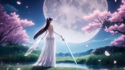 1girl,moon,weapon,sword,dress,long hair,solo,hair ornament,black hair,white dress,petals,night,water,full moon,grass,high heels,full body,back,<lora:girl solo luxueqi_20240911015355:0.8>,<lora:【面部细节优化】拒绝一眼Ai暖白美颜滤镜-冷白皮美颜去油腻_v1.0:0.5>,