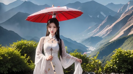 1girl,umbrella,solo,dress,white dress,holding umbrella,jewelry,long hair,black hair,holding,outdoors,chinese clothes,mountain,earrings,necklace,long sleeves,<lora:girl solo luxueqi_20240911015355:0.8>,