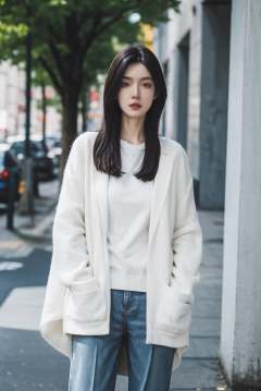 1girl,solo,white sweater,(hands in pockets),standing,looking at viewer,outdoors,street,close-up,Highly detailed,(ultra-detailed),(best quality,masterpiece:1.5),<lora:细节调整2.0:0>,<lora:斗罗大陆2-周漪:0.45>,<lora:Film Simulation:0.6>,film simulation,