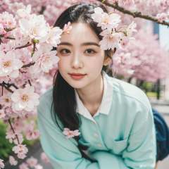 1girl,solo,formal,suit,(hands in pockets),standing,looking at viewer,outdoors,street,flower,cherry blossoms,((close-up:1.5)),film simulation,Highly detailed,(ultra-detailed),(best quality,masterpiece:1.5),