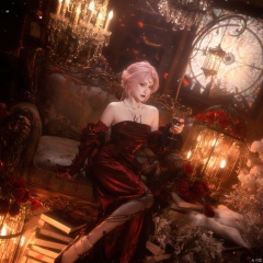 Cosplay fantasy gothic Victorian-inspired woman with pink hair red and black ornate dress pearl necklace holding a glass of wine surrounded by red roses ornate furniture chandelier with candles stained glass window warm lighting dramatic and mysterious mood scattered petals rich red and gold tones elegant and regal atmosphere., local blur, air expansion, air manipulation, fire-rose, rose petals, warm light, fire light, night, fireplace fire, fire, flame, candle in cage, flying sparks, spark, particle effects, flying rose petals, roses, detached sleeves, bridal gauntlets, backless outfit, bare shoulders, rdssd-red-detached-sleeves-sleeve-dress, 1girl, pink hair, solo, flower, short hair, jewelry, petals, rose, sitting, red flower, necklace, stairs, chandelier, gloves, holding, red lips, couch, candle, looking at viewer, red rose, wine glass, strapless, cup, strapless dress, alcohol, facial mark, candlestand, indoors, drinking glass, red eyes, makeup, anklet, chair, book, cage, wine, earrings, lipstick, breasts, birdcage, roses background