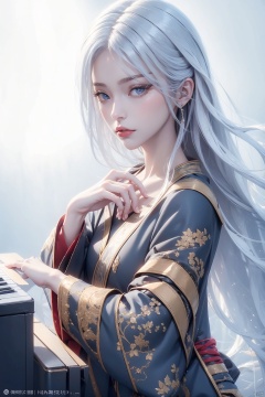 masterpiece, ultra-clear picture quality, real effect, 8k ultra-clear, fine picture effect,white hair,1girl, long hair, looking at viewer, blush, short hair, bangs, blue eyes, simple background,  long sleeves, 1boy, white background, hair between eyes, very long hair, closed mouth, upper body, hetero, japanese clothes, wide sleeves, twitter username, hug, couple, instrument, white kimono, piano, 1girl,yuzu