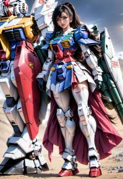 (8k, RAW photo, best quality, masterpiece:1.3), realistic, <lora:sdxl_loha_RX78_v2:0.9>, gundam\(RX78\), 1girl, solo, long hair, black hair, mobile suit, holding, mecha, huge breasts, looking at viewer, blue eyes, (full body:3), bangs, science fiction, open mouth, covered navel, skin tight, weapon, tail, long pants, dancing, red skirt, long shoes, long cape, leg armor:1.5, thighhighs,