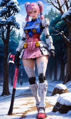 masterpiece, ({1girl is in mache armor with jumping pose, full body, long hair, short skirt}:1.3), realistic:2, intricate detail, highly detailed, great textures, 8k, 100000000 detail, gundam\\(rx78\\), armor, full body, <lora:RX78_SDXL_v3_loha:0.75>,detailed_background,outdoors,black_footwear,highres,toxic_ghost,long_sleeves,blood_on_clothes,holding,tree,weapon,absurdres,solo,1girl,piercing,purple_eyes,snow,holding_axe,breath,standing,holding_weapon,looking_at_viewer,full_body,outdoors,chaps,axe,bloody_weapon,pink_hair,blood,bare_tree,twintails,short_twintails,ear_piercing, (RAW photo, best quality, masterpiece:1.2), ultra high res, (photorealistic:1.4),