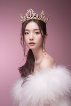The image portrays a young woman adorned in regal attire against a soft pink background. She wears a glittering gold crown that suggests a theme of royalty or high fashion. Her attire includes a fur coat draped elegantly over a delicate lace dress, which adds a touch of luxury and sophistication to the portrait. Her facial expression is serene and contemplative, her large eyes gazing directly at the viewer, creating a captivating connection. The overall color scheme features soft shades of pink and white, complemented by the gold of her crown and earring, enhancing the image's ethereal and rich ambiance. The warm tones and soft focus convey a sense of dreaminess and elegance.