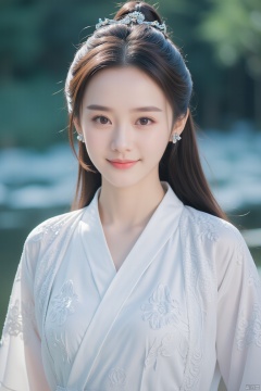 masterpiece, 1 girl, 18 years old, Lovely, Smile, Look at me, Long hair, Delicate eyes, Hanfu, White Han suit, Ornate embroidery, Indoor, Outside the window is a pond, a lotus, Unreal scenes, A fantastic scene, Diamond Earrings, Particle special effect, Moonlight, textured skin, super detail, best quality