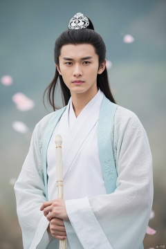 masterpiece, 1 Man, 18 years old, Look at me, Handsome, Long hair, Hanfu, White Han suit, Portrait, Masculine, Muscular development, Strong and healthy, Outdoor, A hazy background, Flying petals, Male focus, Hold the fan, Folding fan, textured skin, super detail, best quality