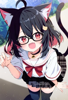 score_9,score_8_up,score_7_up,source_anime,<lora:Siro9_pony:1> BREAK 1girl,animal ears,solo,cat girl,black choker,multicolored hair,two-tone hair,black hair,cat ears,red eyes,glasses,ahoge,animal ear fluff,tail,cat tail,smile,star hair ornament,white shirt,red ribbon,fang,looking at viewer,plaid,thighhighs,:d,black skirt,short sleeves,hair between eyes,pleated skirt,bangs,open mouth,plaid skirt,outdoors,blush,black-framed eyewear,