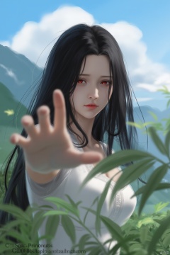 A digital art painting depicting a woman with long dark hair and red eyes. She is wearing a white dress. Her hand was facing the camera as if trying to hold onto something. She had a sad expression, with green leaves in front of her. There is a mountain behind her. The sky above her is blue with white clouds.