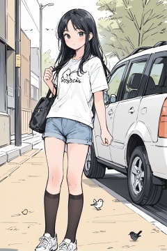 1girl, solo, long hair, shirt,line art, black hair, short sleeves, pantyhose, outdoors, shorts, day, bag, bird, denim, ground vehicle, motor vehicle, legwear under shorts