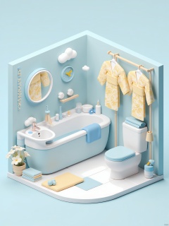 OBdengzhou,This is a digitally created, highly detailed CGI image depicting a stylized, minimalist bathroom scene. The background is a smooth gradient of light blue, creating a serene ambiance. The central focus is a large, white bathtub with a soft blue towel draped over the side. Adjacent to the tub is a white sink with a mirror above it, showcasing a reflection of the bathroom. The sink is adorned with a blue towel and a white toothbrush holder.To the right of the sink is a white toilet, with a blue towel neatly folded on top. A wooden drying rack is mounted on the wall, holding two yellow kimono robes with intricate white patterns. Above the sink, a round clock with a blue face and yellow hands hangs on the wall. The floor is covered in large, square white tiles, and there are additional towels folded neatly on the floor.The room is decorated with white and blue accents, including flowers, clouds, and a sign that reads "MAYMONA" in blue letters. The overall style is clean, modern, and whimsical, with a focus on soft, pastel colors and a minimalist aesthetic. The image is highly detailed, with a smooth texture and a polished, professional finish.