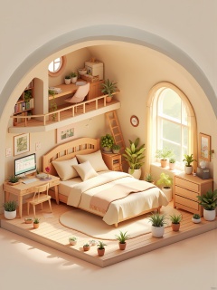 OBdengzhou,This is a highly detailed, digital illustration of a cozy, whimsical bedroom nestled in a modern, open-concept loft space. The room is designed with a soft, warm color palette dominated by earth tones and pastels. The bed, positioned centrally, features a light beige bedspread, a few pillows, and a soft, patterned throw blanket. Surrounding the bed are various potted plants in white and terracotta pots, adding a touch of nature.To the left of the bed, there is a wooden desk with a computer and a small potted plant. Above the desk, a circular window allows natural light to filter in, enhancing the room's warmth. Adjacent to the desk, a small ladder leads up to a loft area where a small chair and a bookshelf are placed, filled with books and more potted plants. On the right side of the room, there is a wooden dresser with a mirror, a small television, and a few more potted plants. The floor is covered in a light, patterned rug, and the walls are adorned with a few small artworks and framed prints. The ceiling is arched, and the overall style is a blend of minimalist and cozy, creating a serene and inviting atmosphere.