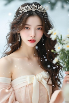 snow,luoxue,a woman with long brown hair, wearing a light pink strapless dress, adorned with a white bow, is adorned with tiny white flowers. Her eyes are a piercing blue, and her lips are painted a vibrant pink. She is wearing a white crown on her head, adding a pop of color to the scene. The backdrop is a stark white, with a bouquet of daisies to the right of her. A pair of pink ballet shoes can be seen in the bottom right corner of the frame.