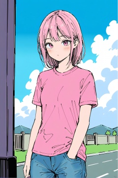 1girl,pink t-shirt,jeans,outdoors,solo,sky,ink drawing