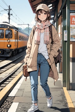 1girl,solo masterpiece, best quality, ultra-detailed, extremely detailed, illustration,STOKYO, STSmatsuri, exterior,real world location, hat,coat, shop, black hair, train station, long hair, short hair, backpack, pants, jeans, jacket, outdoors, denim, shoes, brown hair, walking, scarf, scenery, sneakers, (masterpiece, best quality, beautiful and aesthetic:1.2), (ultra-detailed, extremely delicate and beautiful:1.3), anime