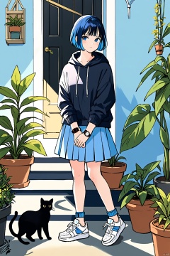 1girl,shoes,solo,plant,hair bun,long sleeves,cat,standing,black cat,bangs,potted plant,skirt,watch,looking at viewer,black hair,short hair,single hair bun,shadow,full body,in the garden,blue hair,sneakers,wristwatch,hood,