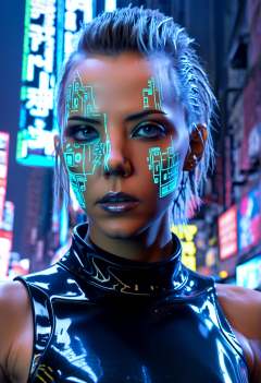 (detailed face), (photorealistic), (masterpiece), (photography), (realistic skin texture), katya clover in a dystopian cyberpunk city, (cyborg:1.3), bladerunner, dark misty street, punk hairstyle, cybernetic face modifications, body modification, Lara Croft video game character, wearing cyberpunk clothes, neon signs, misty,,